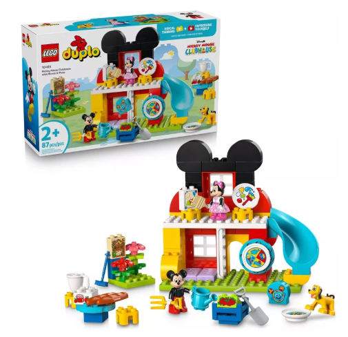 Bring Disney magic to playtime with the Mickey Mouse Clubhouse with Minnie & Pluto (10465) building toy for toddlers ages 2 years old and up. This set of building blocks features a 2-level clubhouse with a slide, an art room, a garden with a bug hotel, tables and chairs and a special door for Pluto. The construction playset includes LEGO DUPLO figures of Mickey Mouse, Minnie Mouse and Pluto, as well as a Toodles the computer decorated brick. Toddlers can spin the Mousekedoer to decide if the characters should feed Pluto, dig the garden, paint a picture or play on the slide, or they can enjoy open-ended play exploring the clubhouse's features. This toddler sensory toy can helps little ones practice fine motor skills as they place garden tools or a paint brush in the characters' hands. Young builders can also develop social and emotional learning skills as they care for Pluto or imagine growing strawberries and making jam for their friends. LEGO DUPLO sets are rigorously tested to ensure they meet the highest global safety and quality standards. Contains 87 pieces.