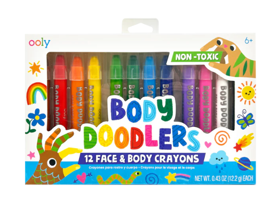 Are you feeling like a clown? A punk rocker? A human flower? Express those whims with this set of face and body crayons! It includes 12 temporary colors so you can transform yourself into whatever you dream up, and then easily wash it off whenever you want. Each non-toxic body crayon twists up so you can add more color whenever you need. Body art crayons are great for adding activities like face painting to a birthday party, or for turning a humdrum afternoon into a creative adventure!