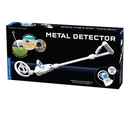 Let the treasure hunting begin! Use the Thames & Kosmos Metal Detector to detect metal objects — like gold, silver, iron, copper, and more — that are buried up to six inches deep in sand, dirt, or grass.