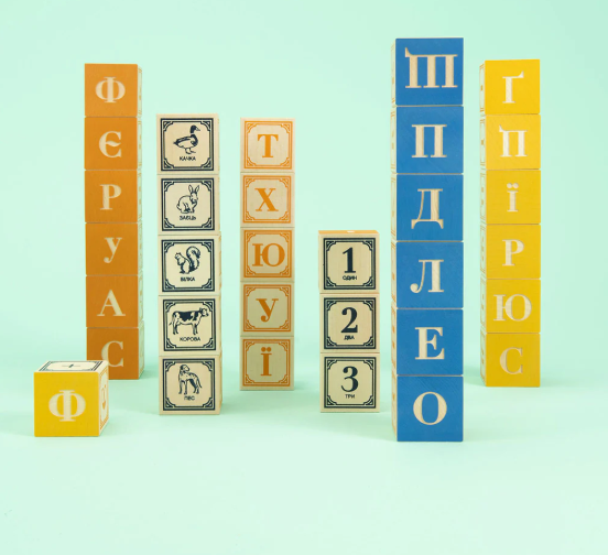 This 32 block Ukrainian language set includes four full alphabets plus the numbers 0-9. Use the math symbols to add, subtract, multiply, and divide. Enjoy the hand crafted animal pictures paired with their Ukrainian translations. Let you fingers linger on the two debossed sides of each colorful block.